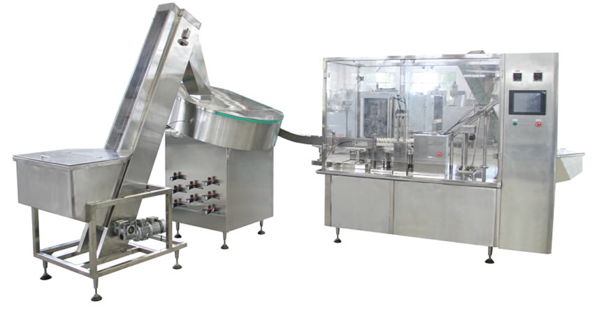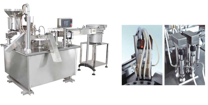 本(běn)機組(zǔ)符合“cGMP”要求,適用於(yú)新型易折塑料瓶的灌裝與熱封口,是(shì)參照國外同類(lèi)機型更新設計而成。 本機通過自動上瓶、底部灌裝、自動上蓋、熱熔式底部封口(kǒu)、機械手送出瓶等一係列特製工序(xù)後完成灌封 工作,是國(guó)內口服液灌裝生產的(de)理想設備。